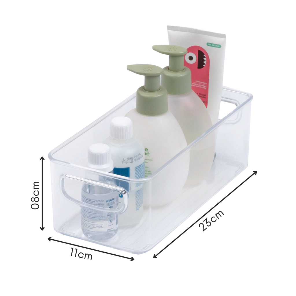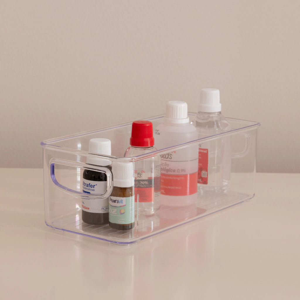 Feito em acrílico transparente e com alças funcionais, ele facilita o dia a dia e mantém tudo visível, separado e sempre à mão.