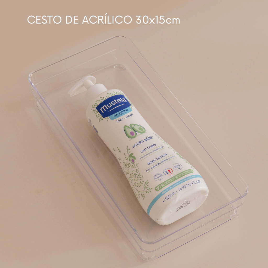 Com 10 cestos de acrílico em tamanhos variados, 3 dobradores e 2 cartelas de etiquetas de identificação, ele permite que tudo fique no lugar certo — visível, acessível e com um visual impecável.