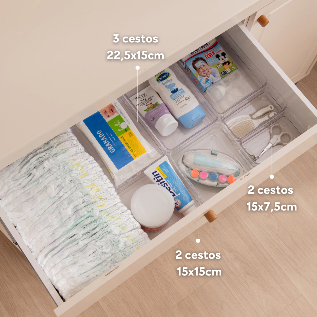 Benefícios: Visibilidade total das peças, padronização da gaveta e muito mais praticidade na hora de vestir o bebê e manter a organização.