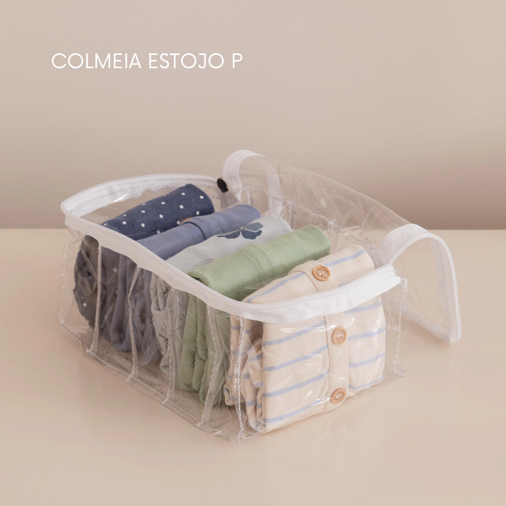 Benefícios: Tudo separado por tipo e fase, mantendo o guarda-roupa e a bolsa organizados e funcionais.