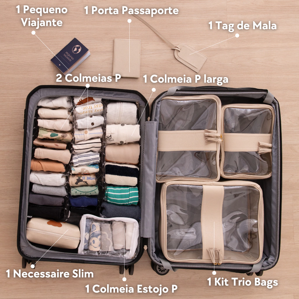 Com colmeias, necessaires, bags e itens personalizados, ele garante uma mala organizada, visualmente clara e com tudo à mão — sem bagunça e sem perder tempo procurando nada.