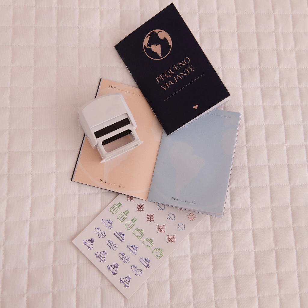 O Kit Pequeno Viajante + Carimbo foi criado para eternizar os momentos especiais das viagens com seu filho ou filha de forma leve, divertida e cheia de carinho.