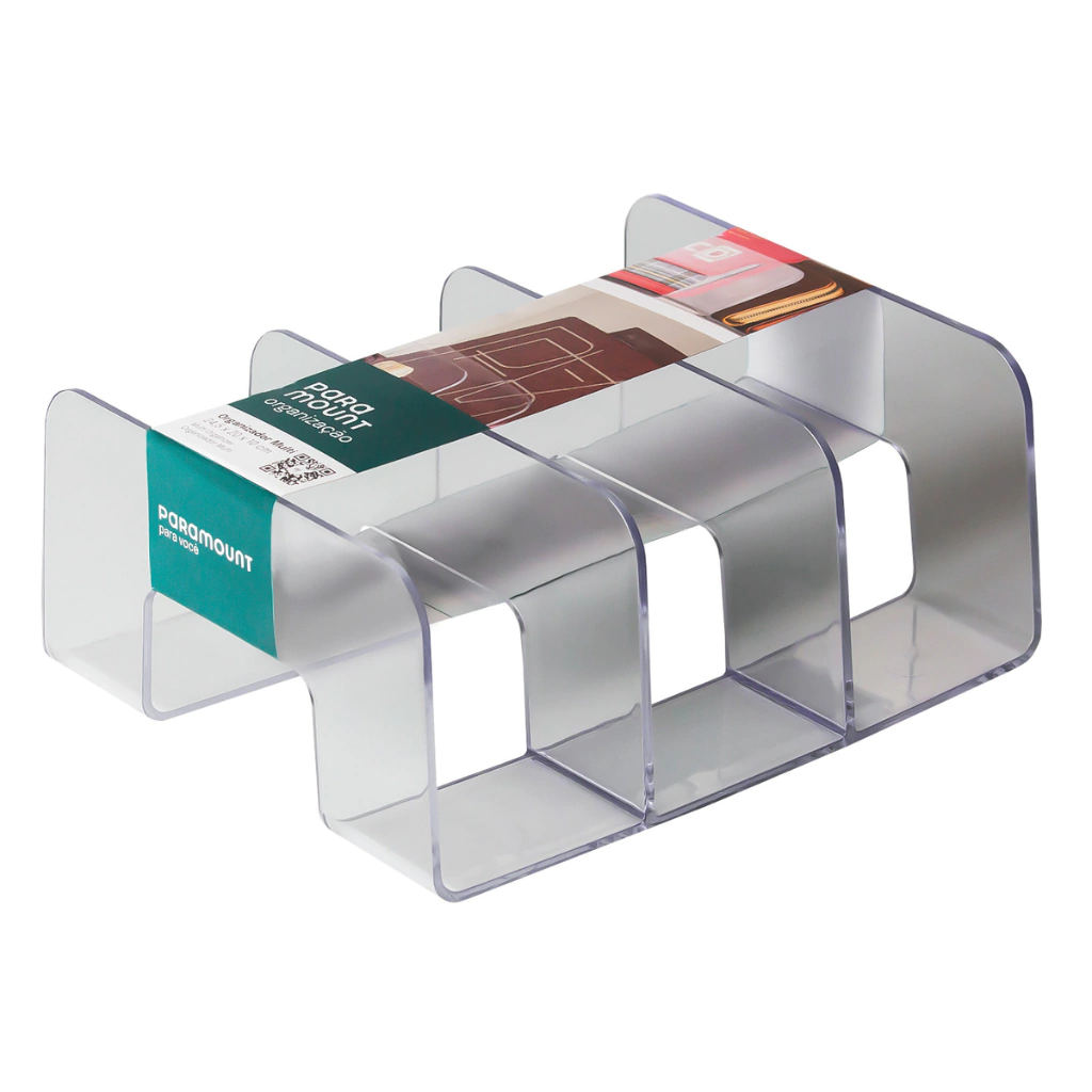 Feito em acrílico transparente e com 3 divisões, ele facilita o dia a dia e mantém tudo visível, separado e sempre à mão.