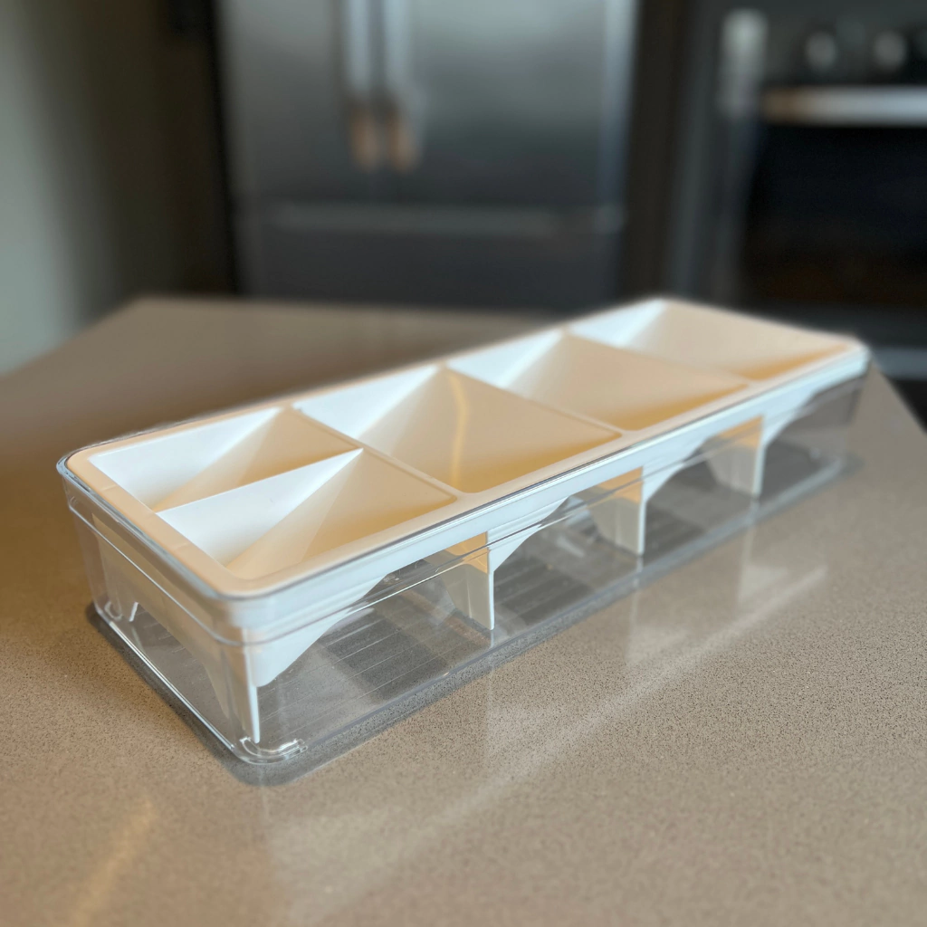 Com estrutura em acrílico transparente e base branca removível, ele acomoda potes de forma inclinada, facilitando o acesso e a visualização dos rótulos.